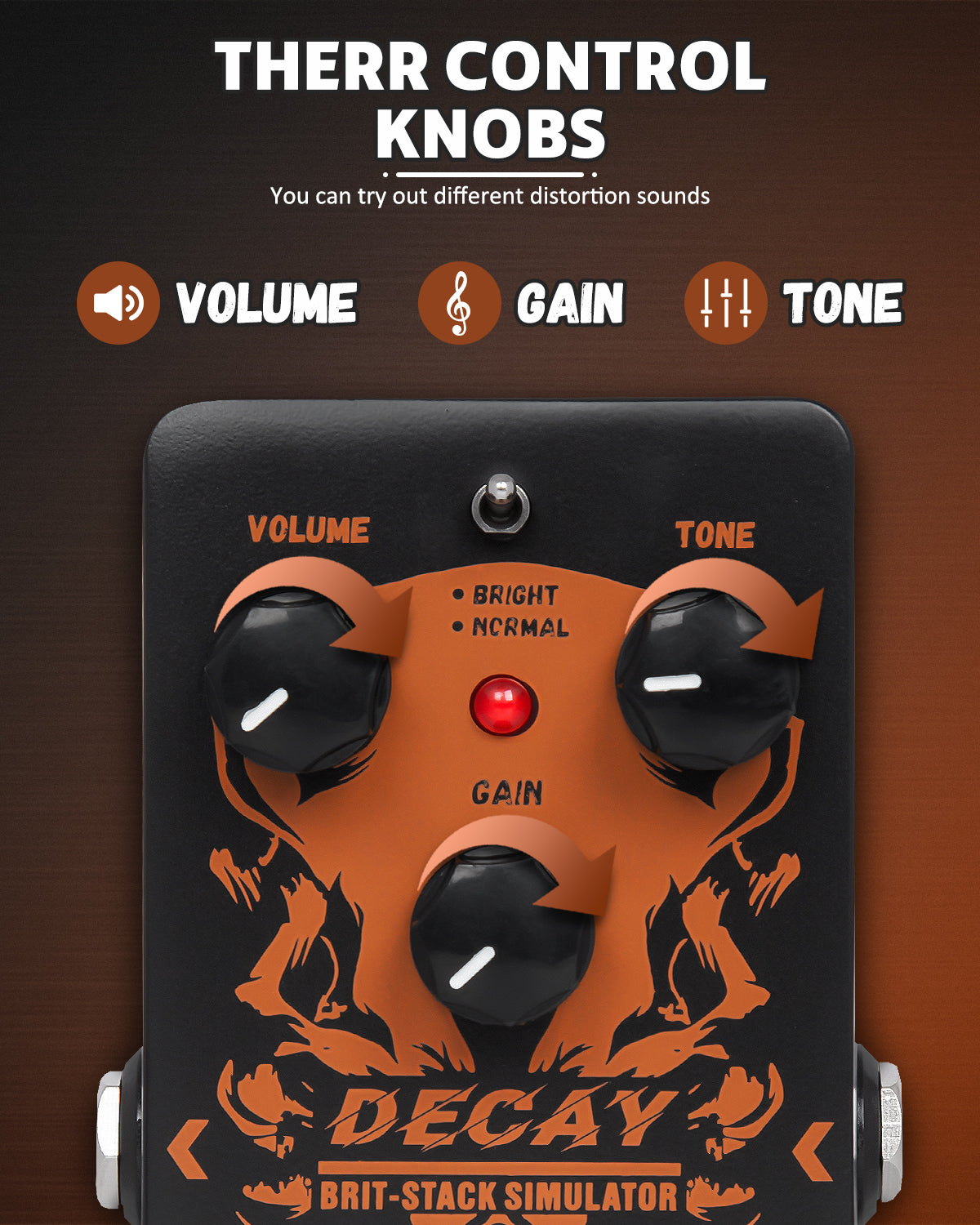 - High-Gain Distortion: Wide distortion gain range, suitable for various metal and rock styles. Vol/GAIN/TONE knobs individually control distortion level and tone brightness.
